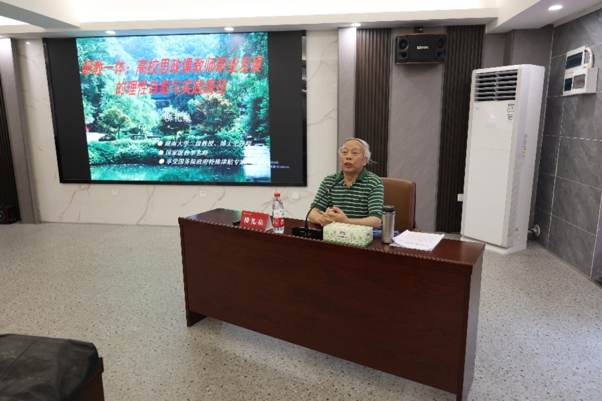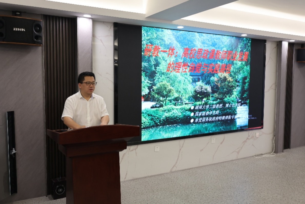 为落实省情集体备课会精神,在分课堂集中交流研讨环节,学院特邀国家级教学名师、湖南大学柳礼泉教授以“研教一体:思政课教师职业发展的理性自觉与实践路径”为题为学院教师做专题报告。柳教授主要围绕立业与强基、相济与互促、相克与相生、相融与相长四个方面展开分享,为青年教师解开了“研”与“教”两张皮的困惑,从政治高度、学理深度和师生相处温度等维度阐释了高校思政课教师如何打通从“职业”到“事业”的“任督二脉”,如何强化言为士则、行为世范的自觉,如何做学生为学、为事、为人的大先生。