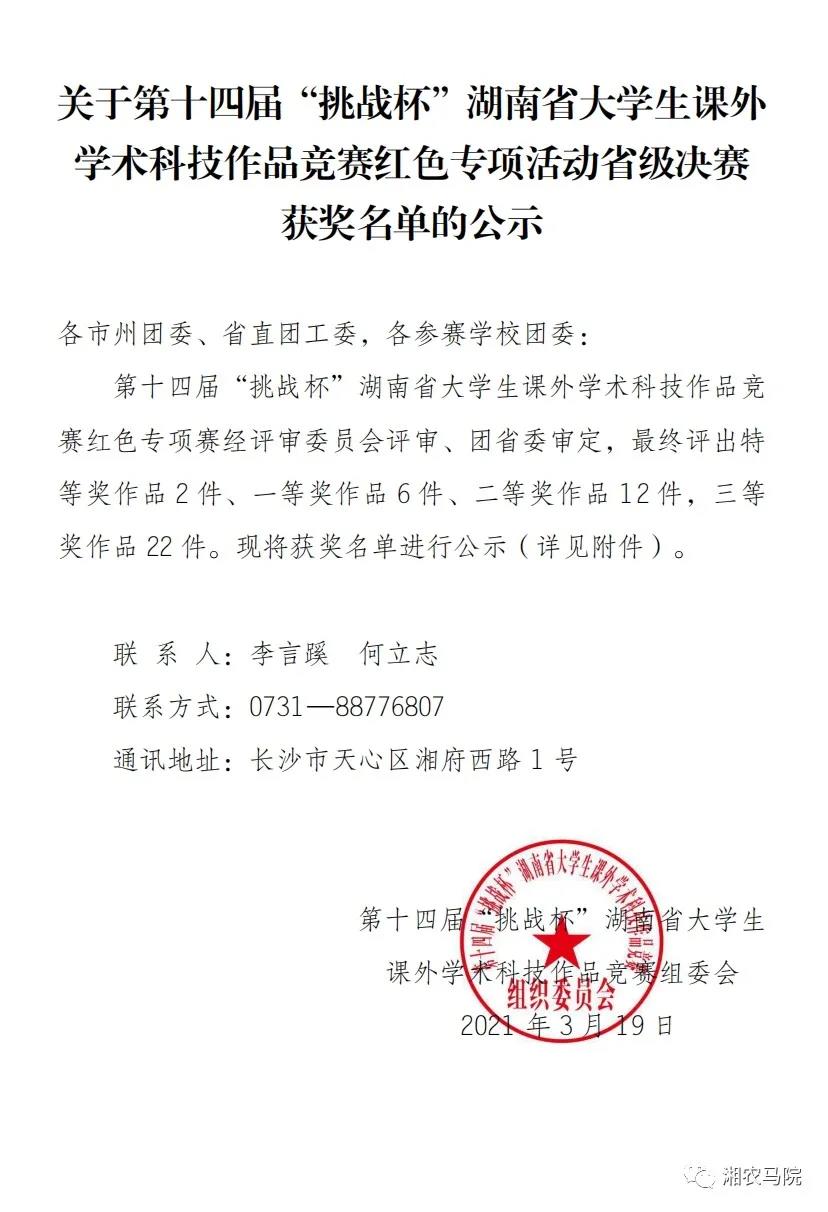 第十四届”挑战杯“湖南省大学生课外学术科技作品竞赛红色专项活动省级决赛已经结束。”挑战杯“大赛是中国最具代表性、权威性、示范性、导向性的大学生竞赛,是高校学科竞赛排行榜重要赛事之一。