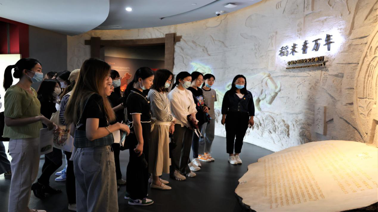 首先,同学们走进了《稻米香万年—中国水稻历史文化陈列》展厅,在静谧的环境中,新媒体技术手段和深厚的稻米文化相互交融,道出了水稻的源起、描述了稻作文化的发展以及稻作民俗的内涵,让同学们充分地感受到了水稻的文化魅力和历史印记。