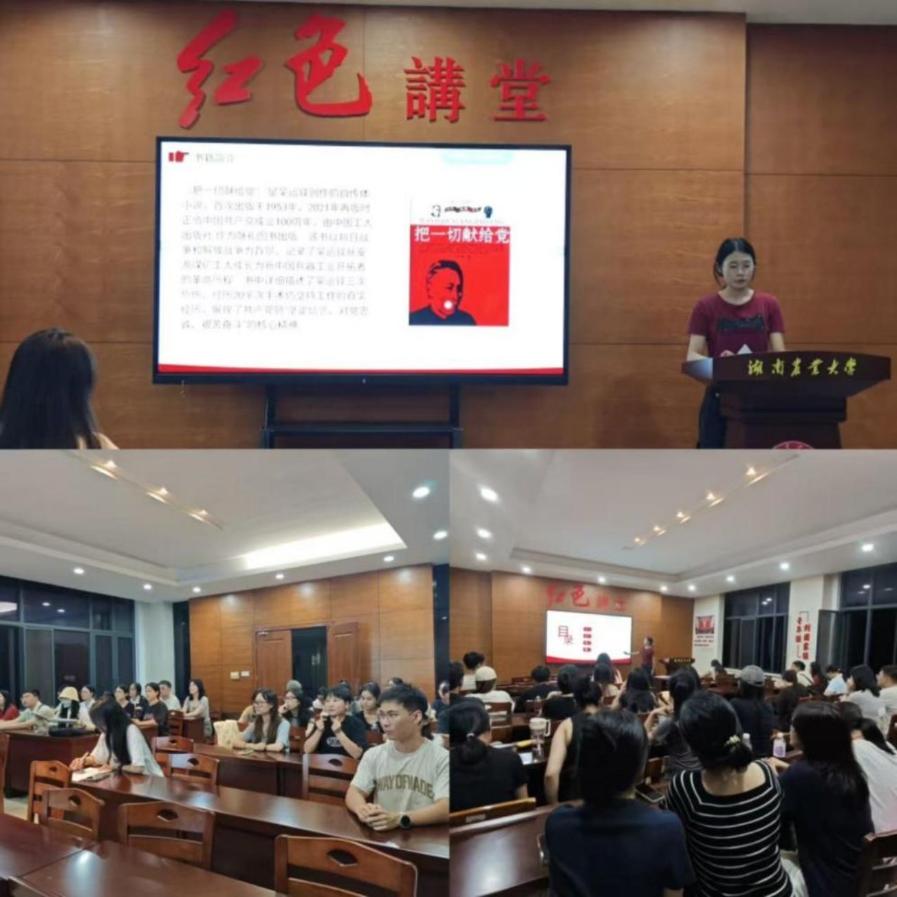 2023 级硕士研究生、中共党员邹宇婷担任读书分享人,带领大家阅读兵工专家吴运铎的自传体小说《把一切献给党》。她以作者革命经历为切入点,结合抗战与解放战争背景,讲述吴运铎从贫困矿工成长为新中国兵器工业开拓者的历程:早年苦难使他体会阶级压迫,日军入侵坚定其“工业救国”信念;1941 年临危受命建年产 60 万发子弹的工厂,他直面场地、材料、工具难题,多次在武器试验与生产中遇险,历经三次重伤、20 余次手术,即便截肢、失明仍凭“把一切献给党和人民”的意志重返岗位。分享结束后,段浩盈、陈威宇、隆森林三位同志围绕书中精神与现实意义交流提问,深化了对“忠诚于党、奉献人民”理念的理解。